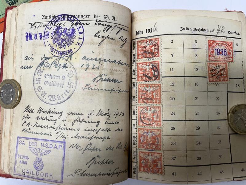 This N.S.D.A.P. membership I.D. booklet shows some great early SA stamps
