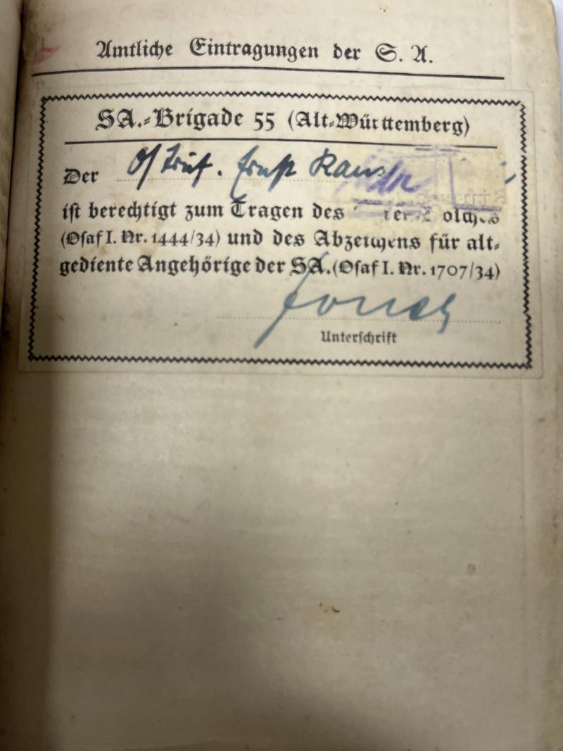 1) First model N.S.D.A.P. membership I.D. booklet of Rauschenbach who was ordered to train and lead a "S.A.Reservestürms" within "Stürmbann" II/121