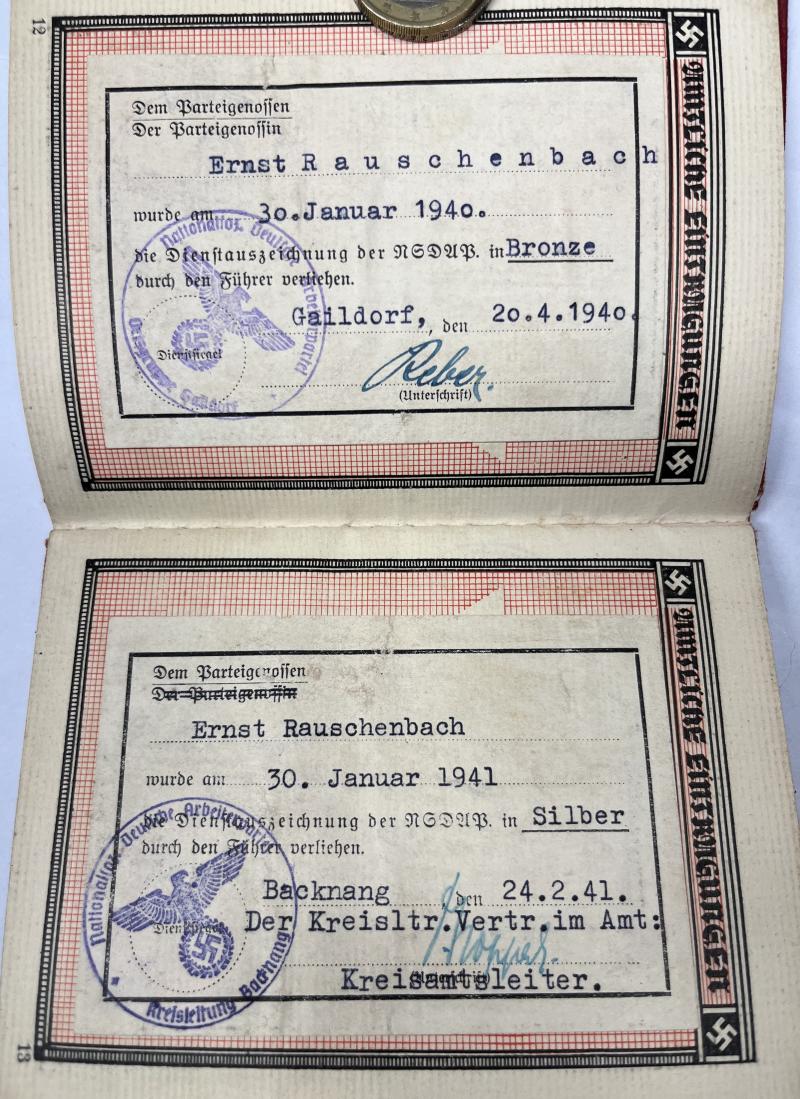 The booklet shows both "Dienstauszeichnung der N.S.D.A.P.in Bronze" and "Dienstauszeichnung der N.S.D.A.P.in Silber" (for 10 and 15 years of service within the N.S.D.A.P.)