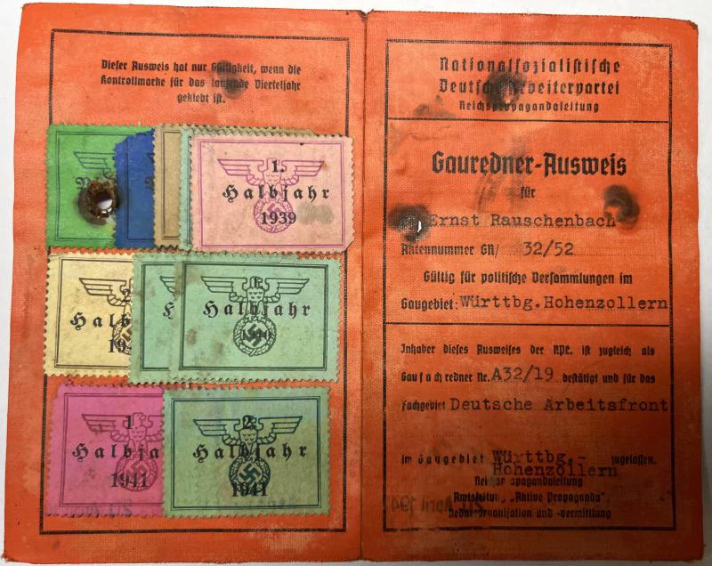 3) Rare "Gauredner-Ausweis" (regional speaker) - (I.D.) of "Gauleitung" Württemberg-Hohenzollern