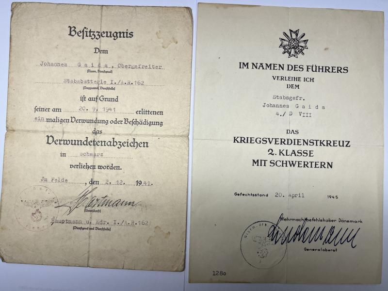 2) Nice special print KvK II m.Schw. citation of Gaida who served under command of "Wehrmachtsbefehlshaber Dänemark"