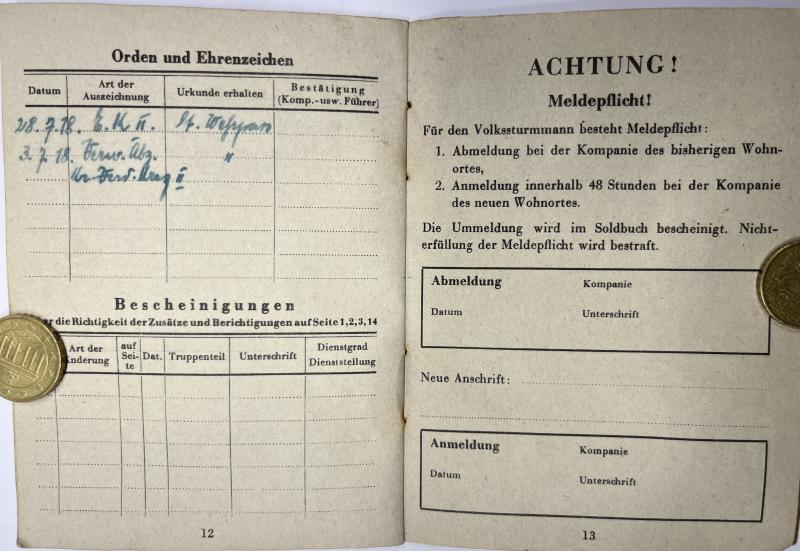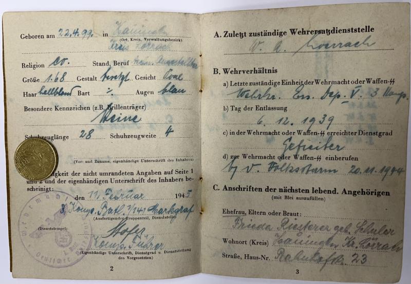 "Volkssturm" Soldbuch of "Kompanie Truppführer" Fritz Riesterer who served within 3.Komp.Batl.1/141 Markgraf