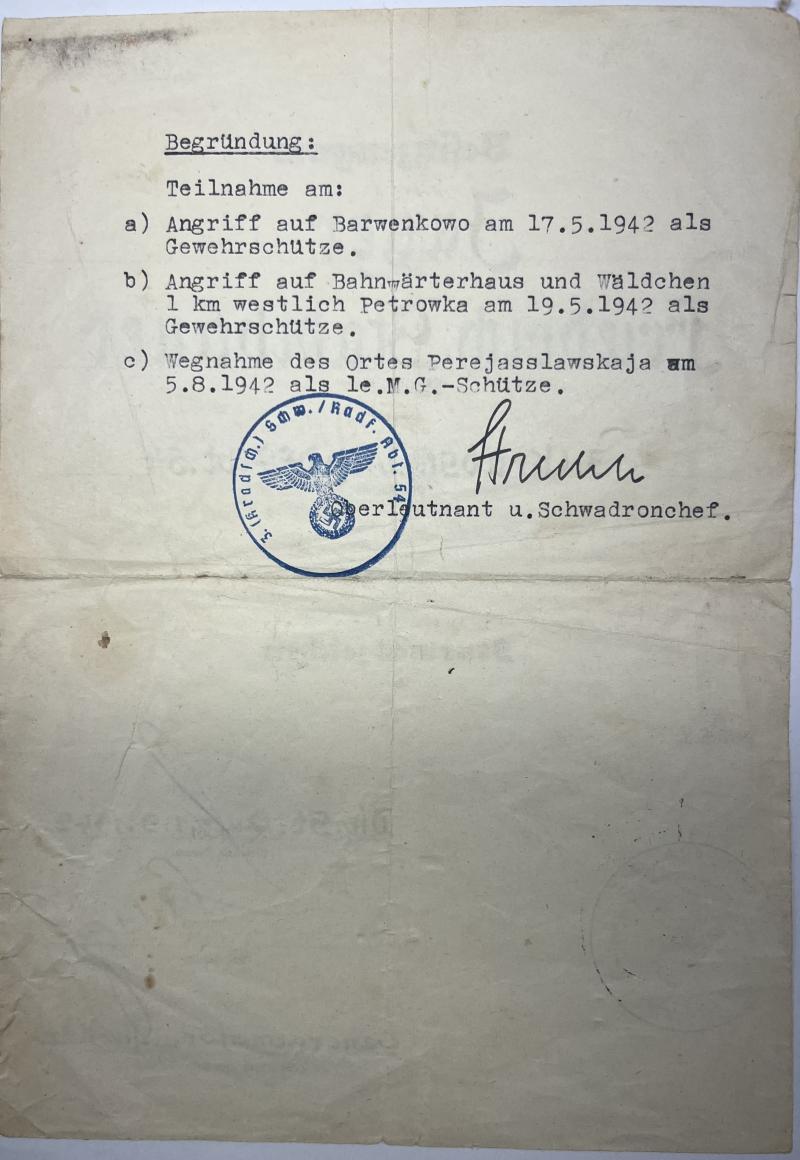 Citation set of "Gefreiter" Friedrich Stadlbauer who served within (Kradschützen) RadfahrAbt.54 of the 1.Geb.Div.
