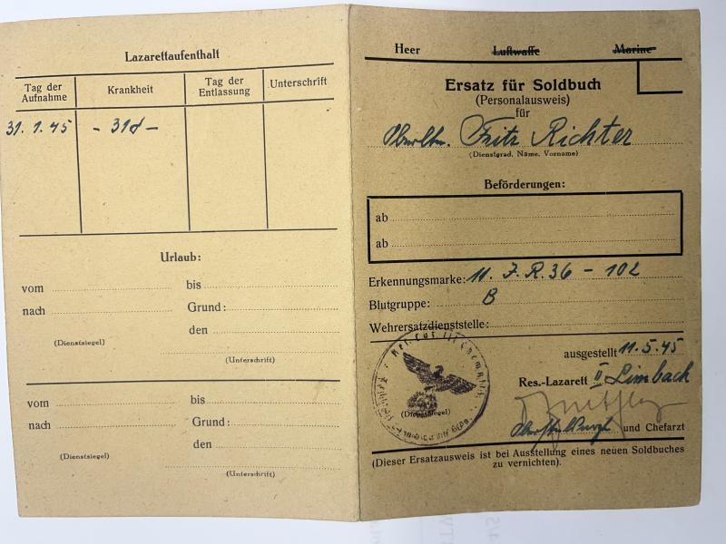 "Ersatz für Soldbuch" (replacement for Soldbuch) from "Oberwachtmeister"? Fritz Richter who served within finally within the 15.Inf.Div.