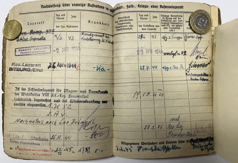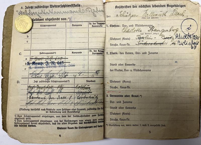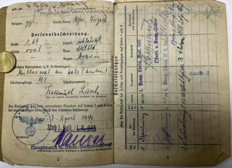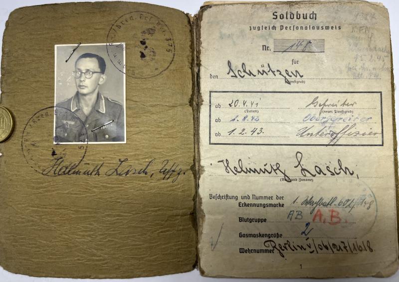 Soldbuch of "Unteroffizier" Helmuth Lasch who served finally within Sicherungs Rgt.375 of the 454.Sich.Div.