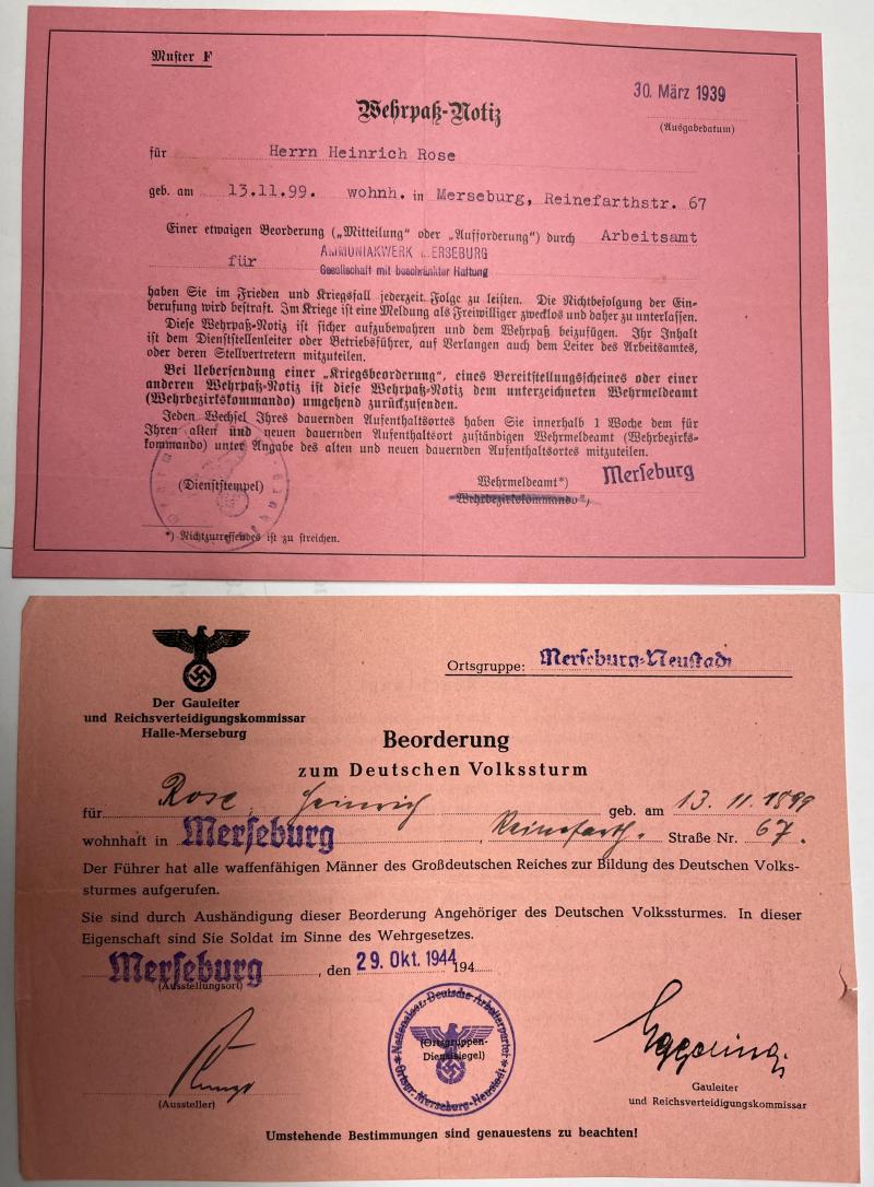 Wehrpass with few entries of WW I veteran Heinrich Rose who was drafted for the "Deutschen Volkssturm" at Halle-Merseburg on 29-10-1944