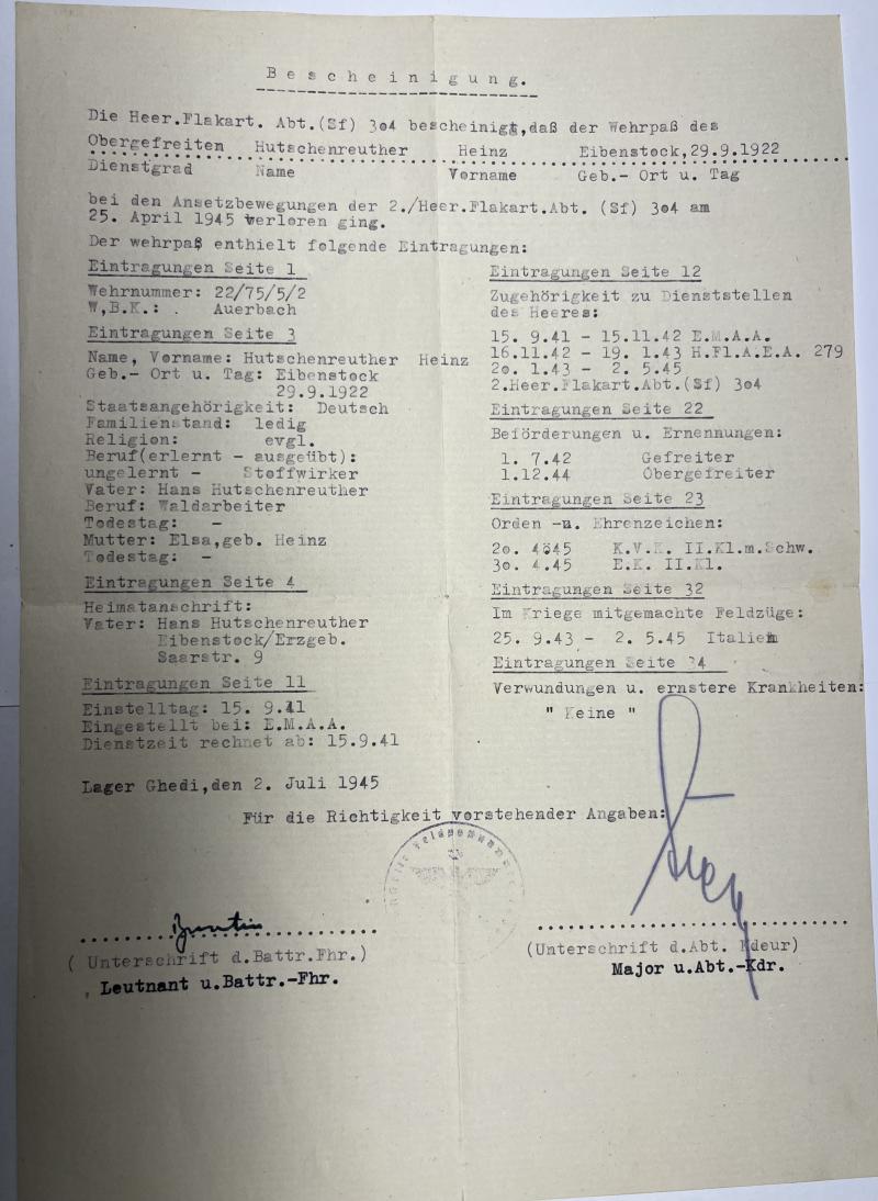 3) "Bescheinigung" (certification) which confirms the loss of Hutschenreuters Wehrpass during the fierce fightings near Bologna at 25-4-1945!