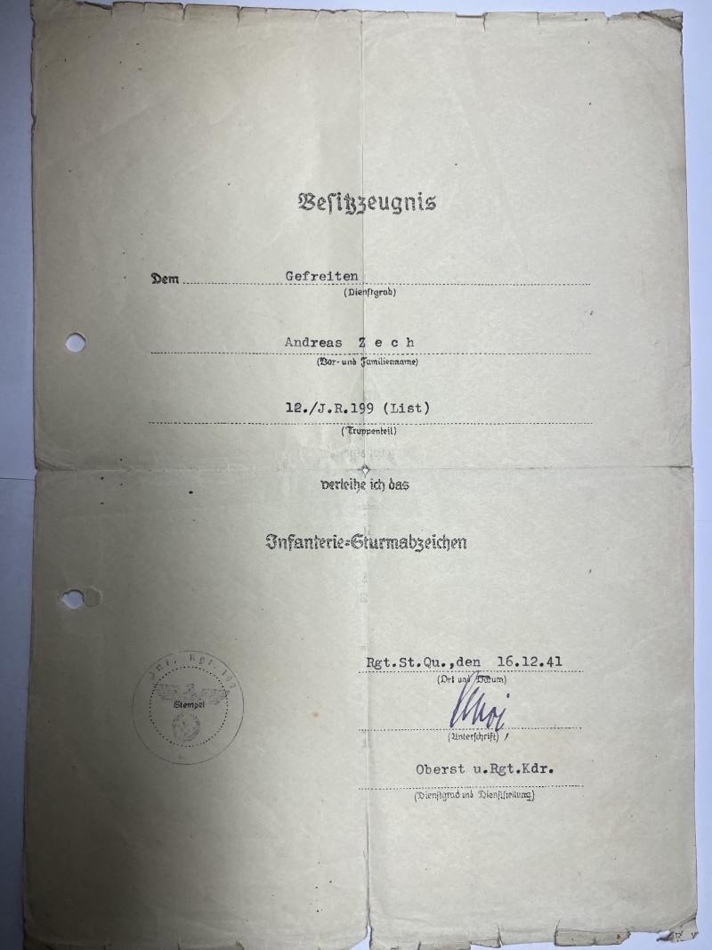 2) A4 size "Infanterie-Sturmabzeichen" which has been signed by "Oberst" and regimental commander Heinrich-Anton Deboi (RK 10-9-1942,DKiG 21-2-1943)