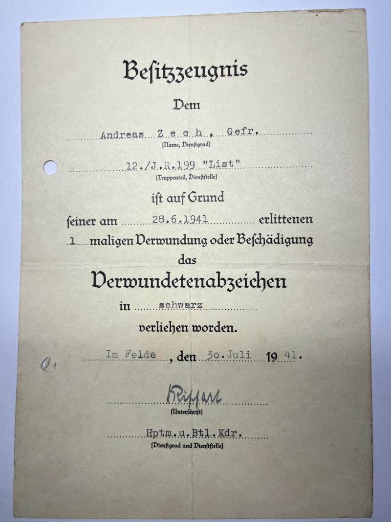 Citation grouping of "Unteroffizier" Andreas Zech who served within Inf.Rgt.199 (aka regiment "List" which was the unit A.Hitler served in during WW I) of the 57.Inf.Div.