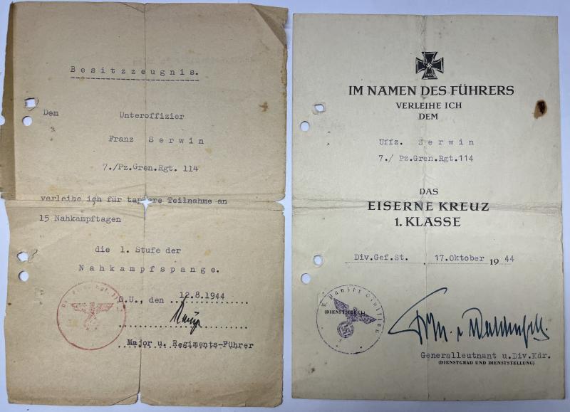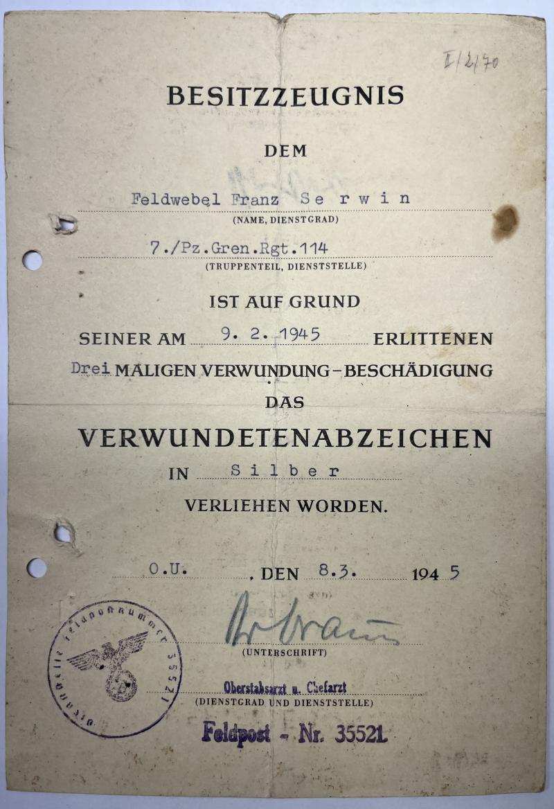 Citation grouping of "Feldwebel" Franz Serwin who served within Pz.Gren.Rgt.114 of the 6.Pz.Div.