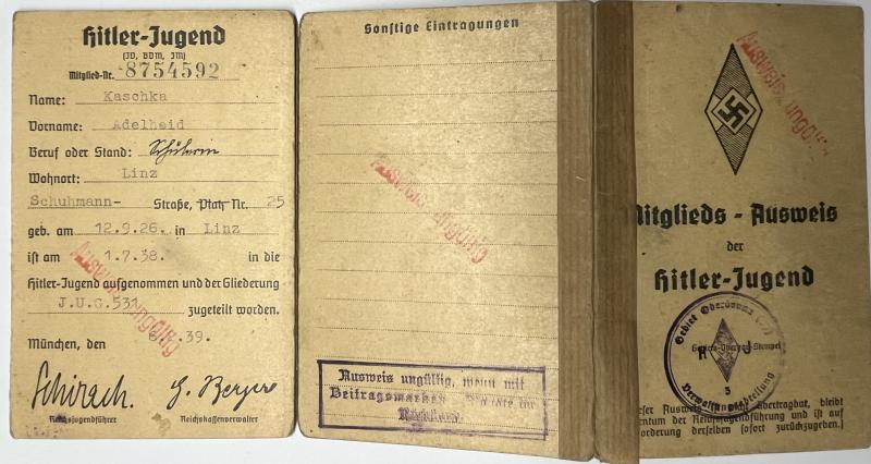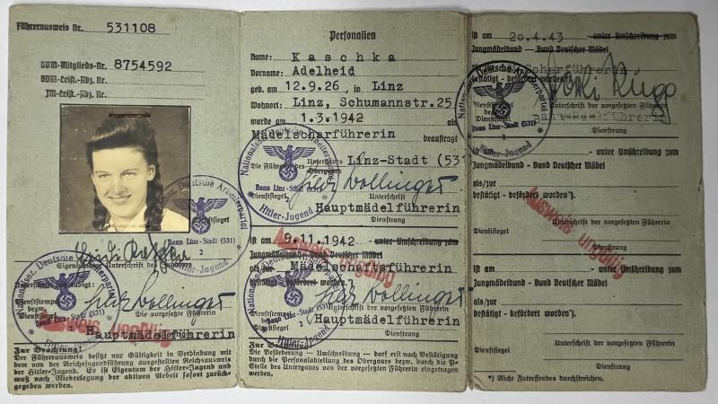 "Bundes Deutscher Mädel in der H-J" I.D. set of Adelheid Kaschka who served wthin "Untergaues Linz-Stadt (531)"