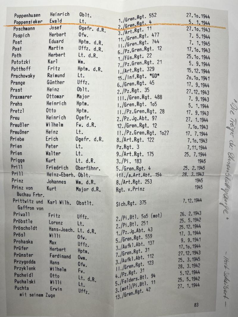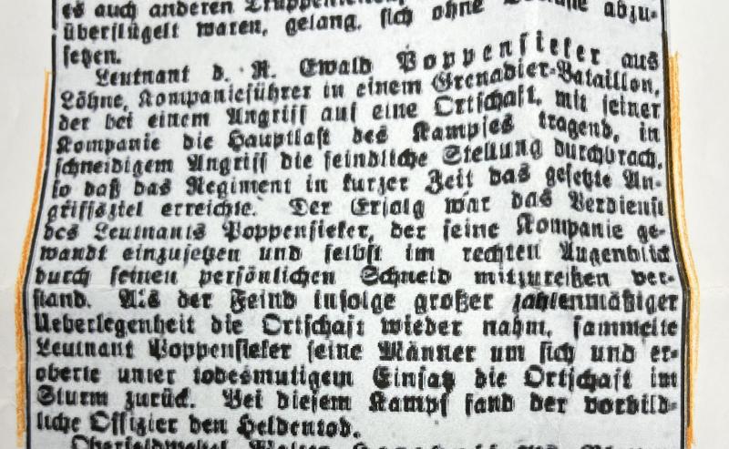 Poppensieker who acted as "Kompanieführer" was awarded the EK II ,the "Infanterie Sturmabzeichen" ,the EK I ,the BWB and the "Ehrenblattspange" (posthumously 5-1-1944).