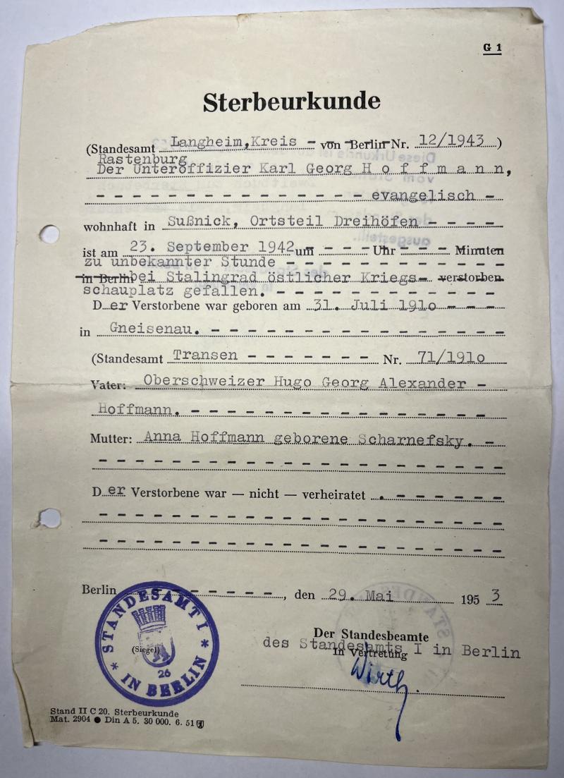 According the "Sterbeurkunde" (death citation) and page 26 of the Wehrpass ,Hoffmann was KIA on 23-9-1942 at Stalingrad!