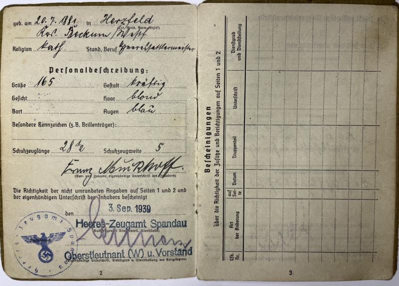 Soldbuch of "Heereshauptwerkmeister" Franz Muckhoff who had served under command of the 95.Inf.Div. and 82.Inf.Div. before.
