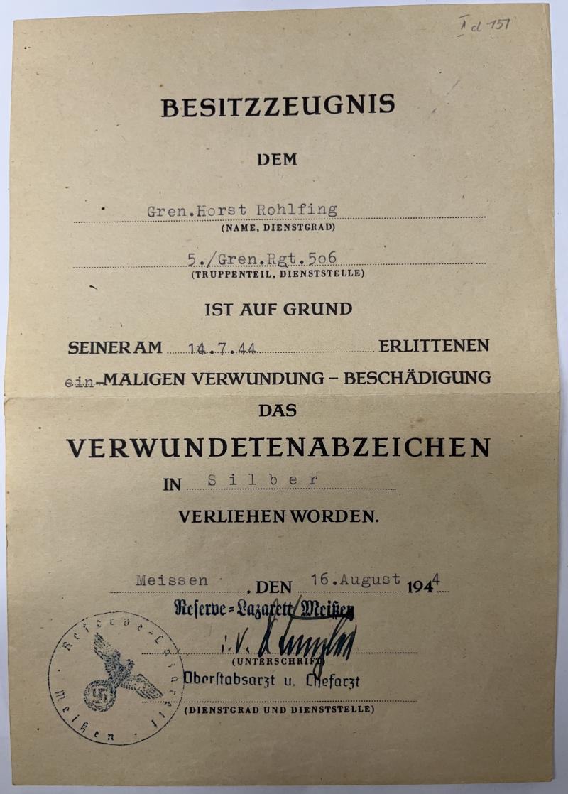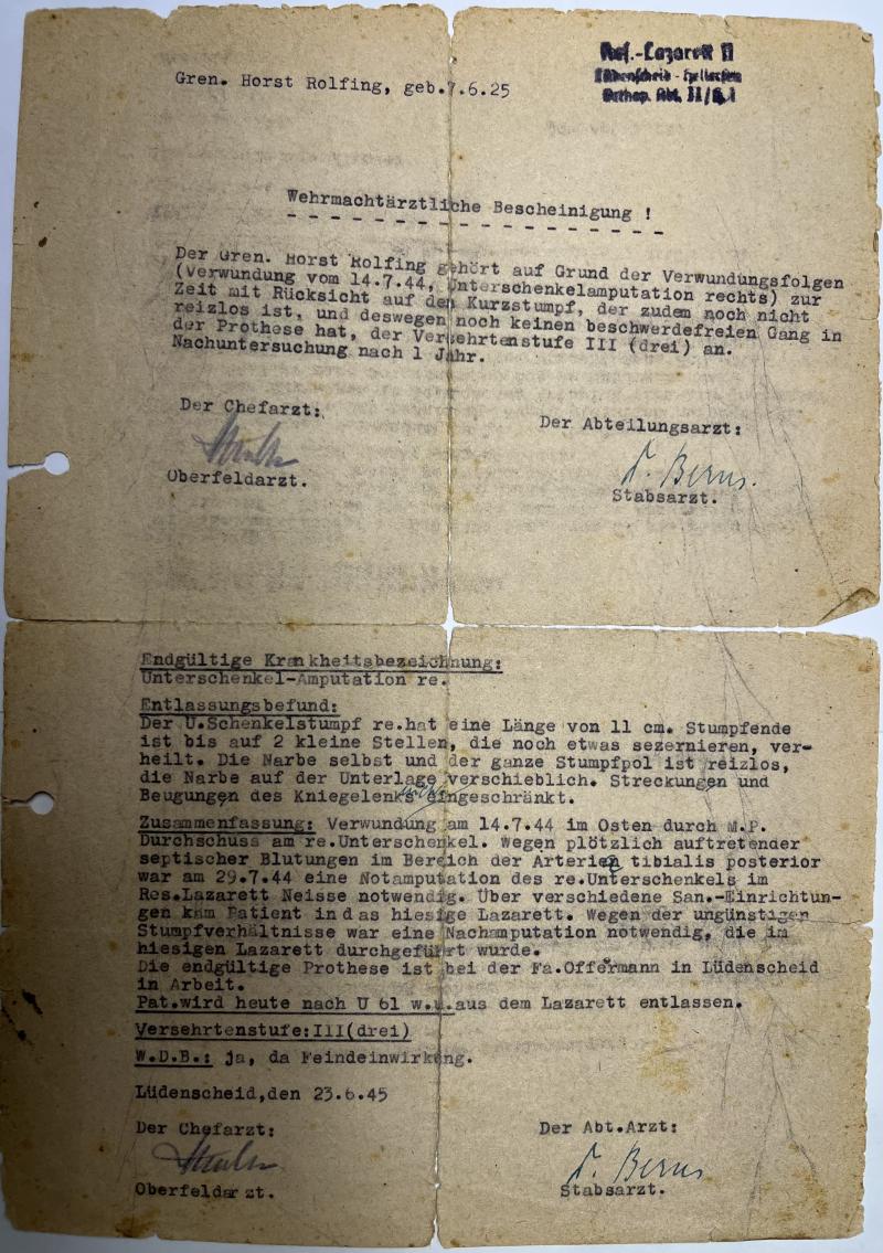 Rohlfing was severely wounded on 14-7-1944 and had his lower leg amputated.