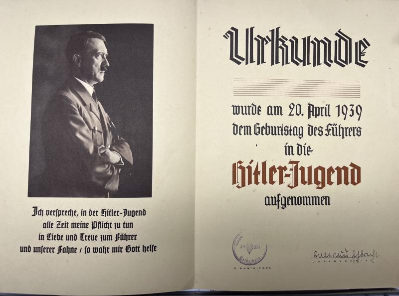 Very attractive A4 size confirmation form/citation which has not been handed-out (though filled in) to ? who entered the "Hitler-Jugend" on the birthday of Adolf Hitler (20-4-1939).
