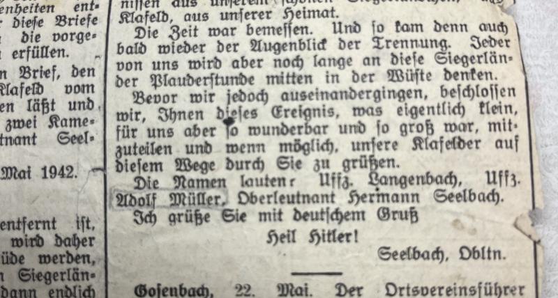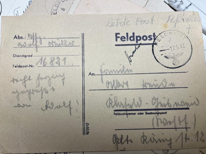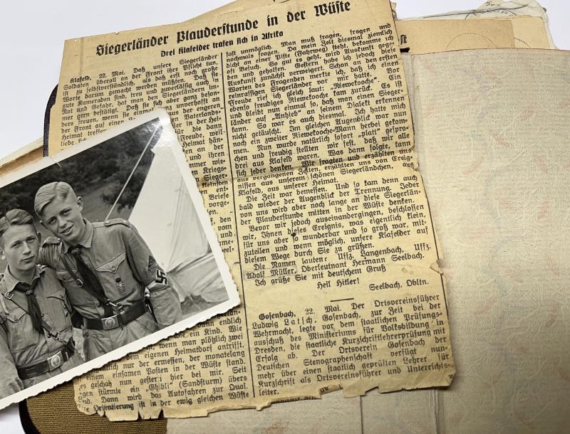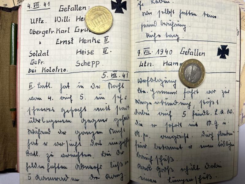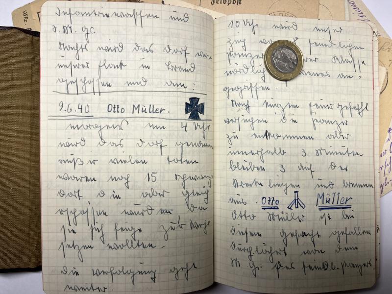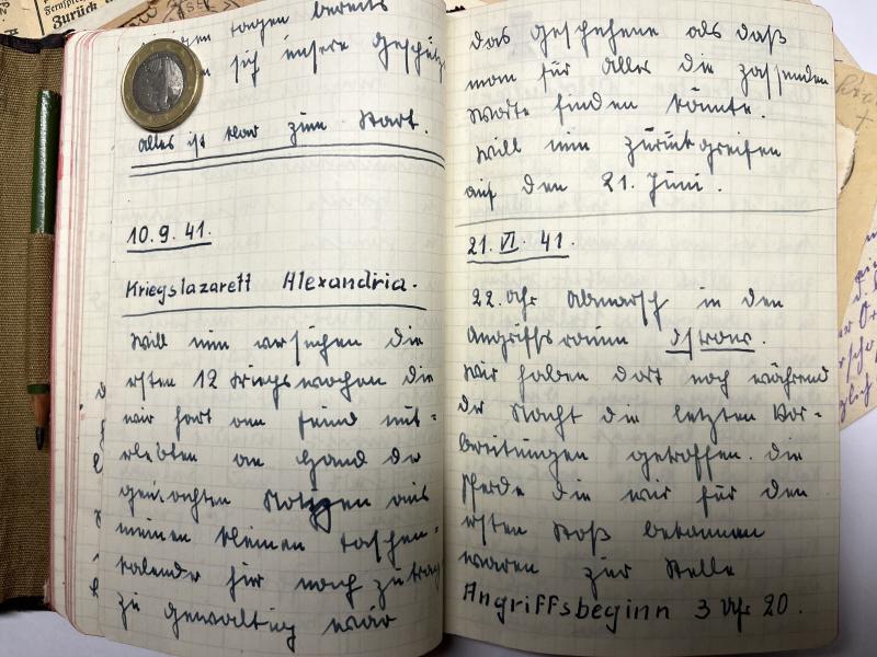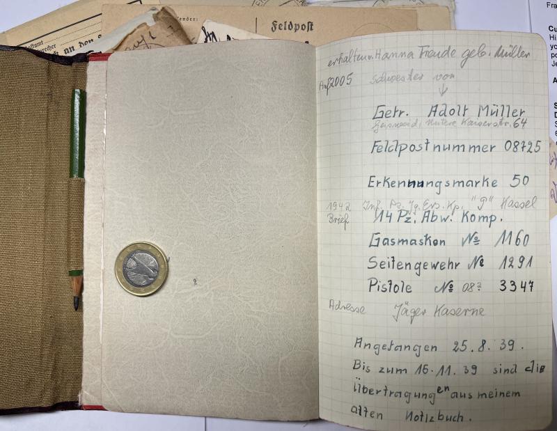 "Kriegstagebuch" (war diary) which shows notes from 25-8-1939 till 27-12-1941,and "Feldpost" of "Unteroffizier" Adolf Müller who originated from Klafeld (Germany) and served within Pz.Jäger Abt.33 of the 15.Pz.Div. (Feldpost Nr.16821)