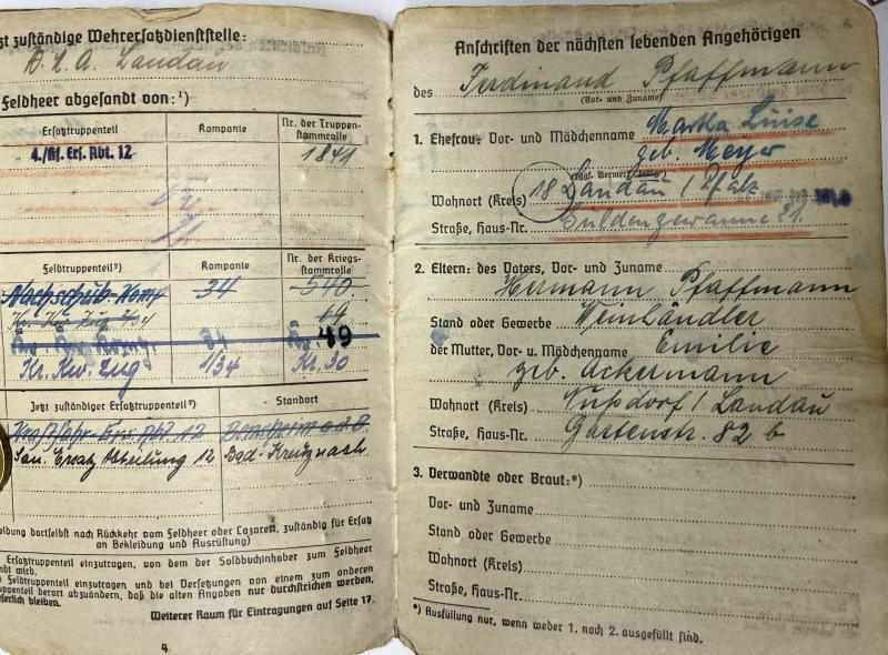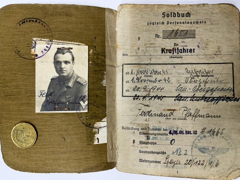 Soldbuch and RC I.D. of "Sanitäts Unteroffizier" Ferdinand Pfaffmann who served within Kraftfahr Krankenwagenzug 34 of the 34.Inf.Div.