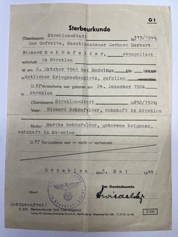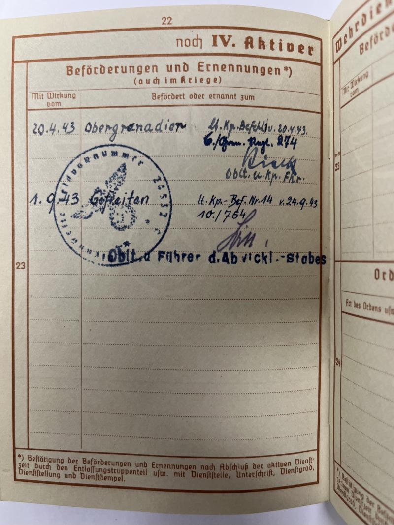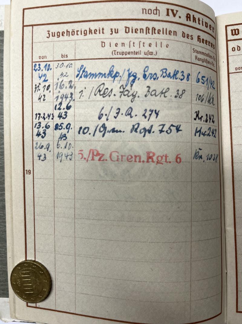 Wehrpass od "Gefreiten" Gerhard Schönfelder who served within few different units of which Pz.Gren.Rgt.6 of the 7.Pz.Div. was the last. Schönfelder was KIA on 6-10-1943 at Medwin (Russia)