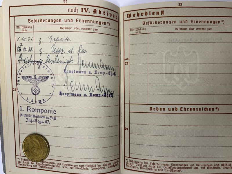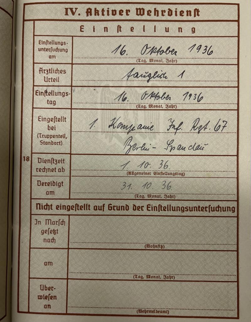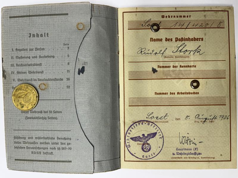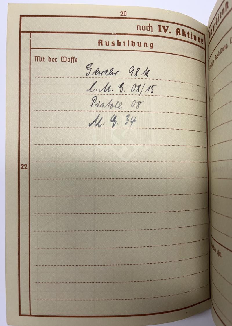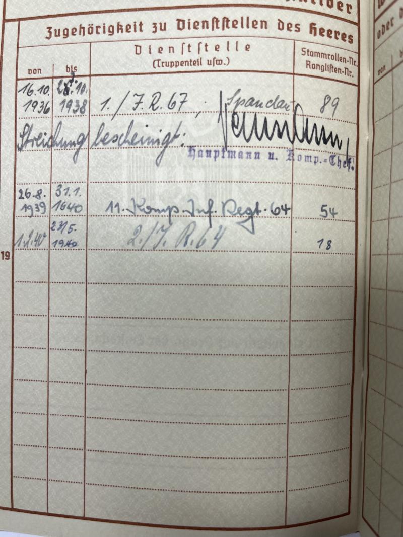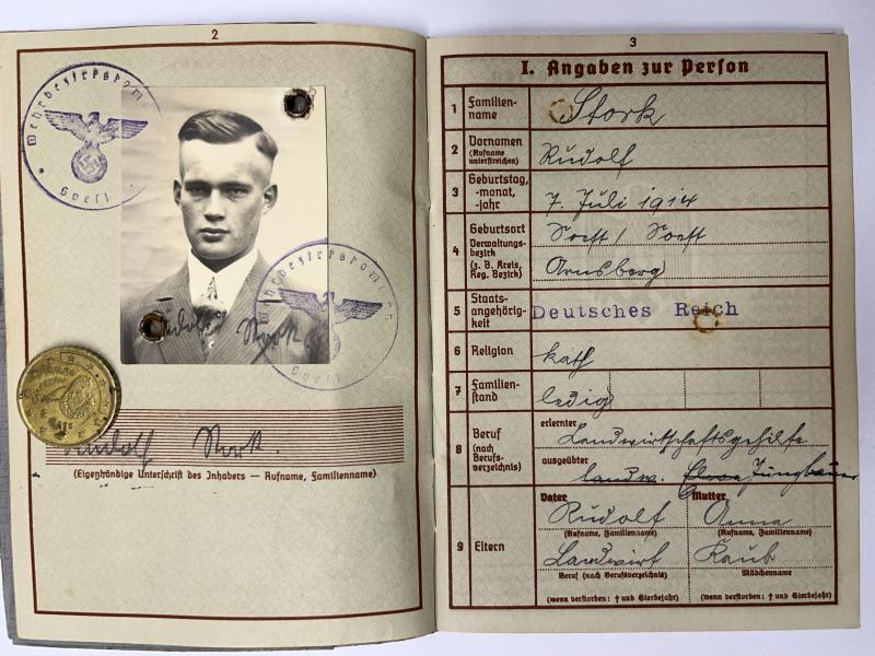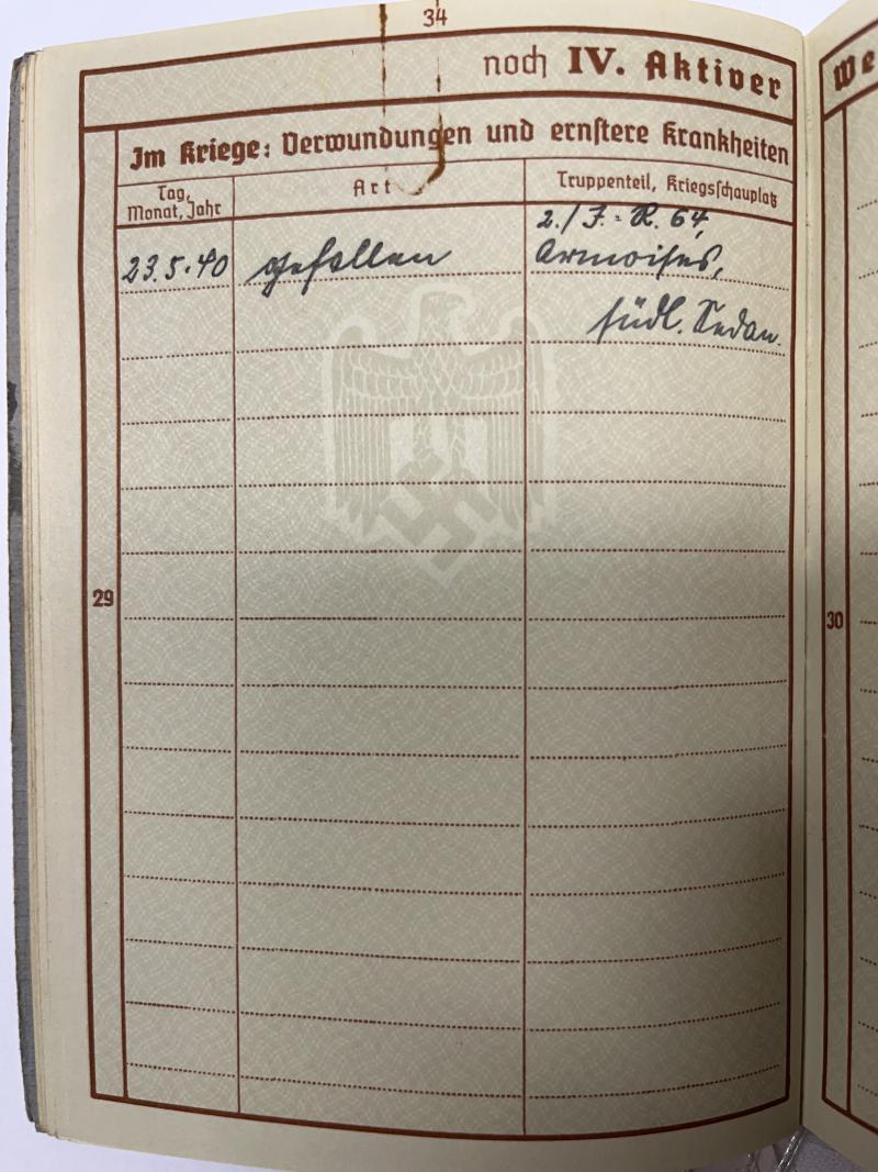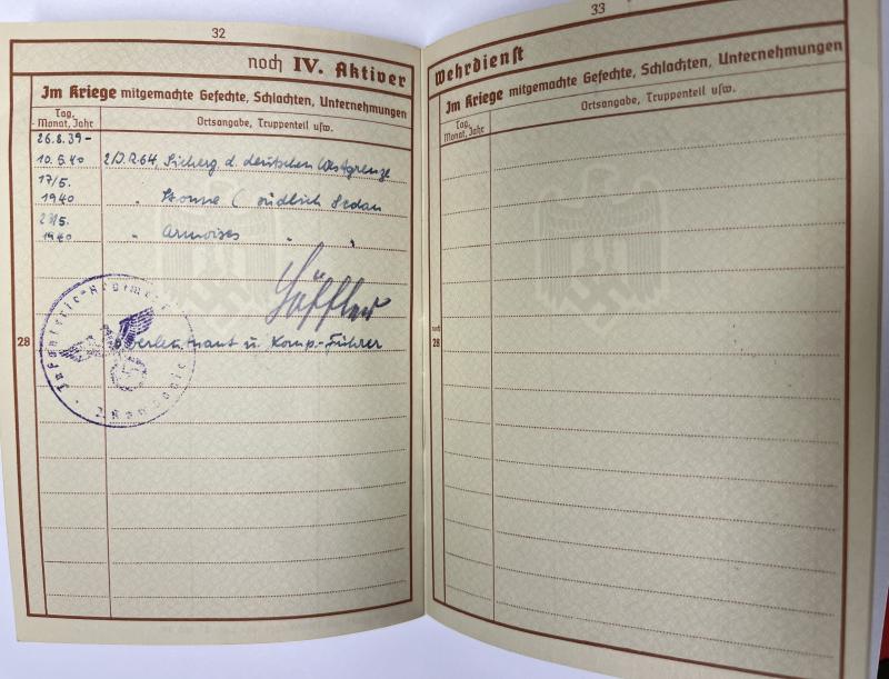Wehrpass of "Unteroffizier der Reserve" Rudolf Stork who served within Inf.Rgt.64 of the 16.Inf.Div. Stork military career lasted only short as he was KIA on 23-5-1940 south of Sedan.