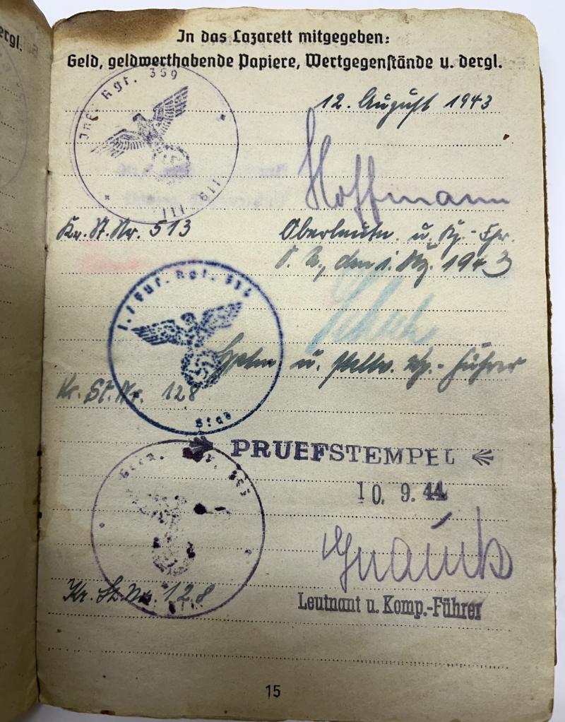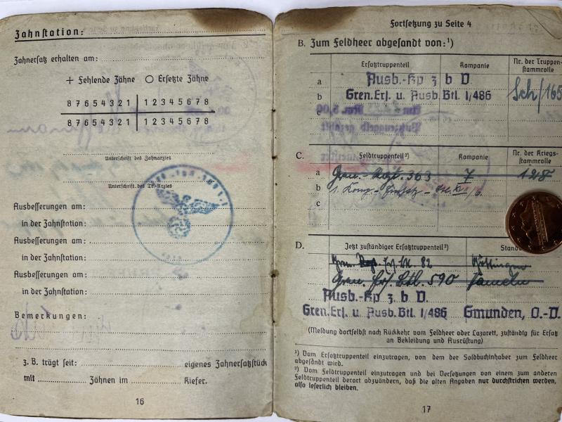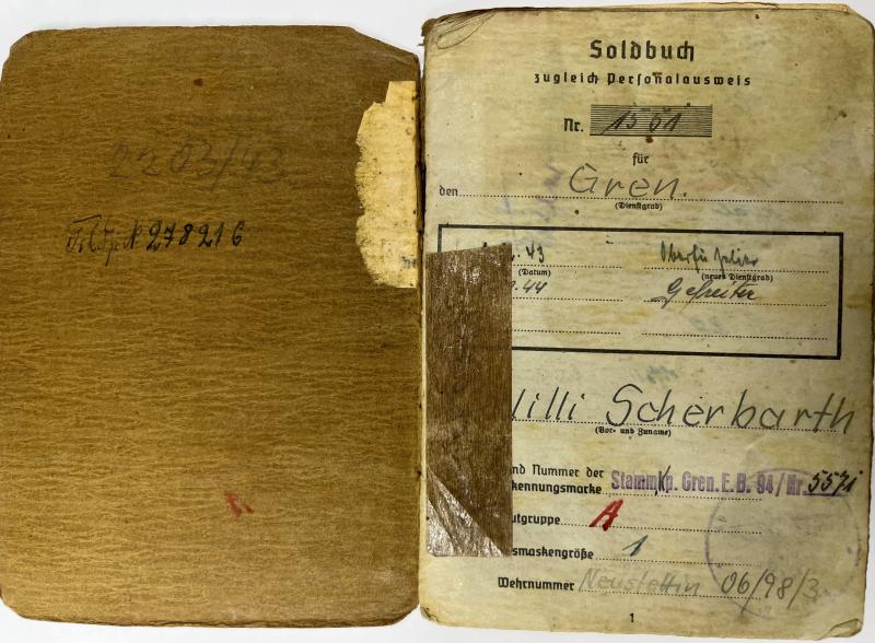 Soldbuch of "Gefreiter" Willi Scherbarth who served within few different units within the 181.Inf.Div. The last unit seems to be 1.Komp.-Einsatz-Btl.XVII (17)?