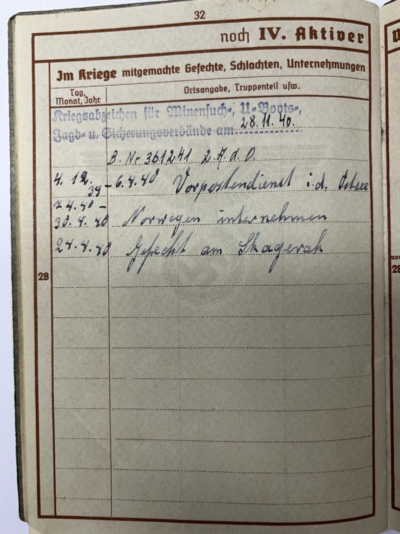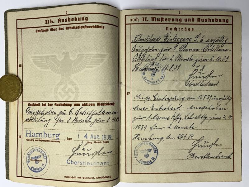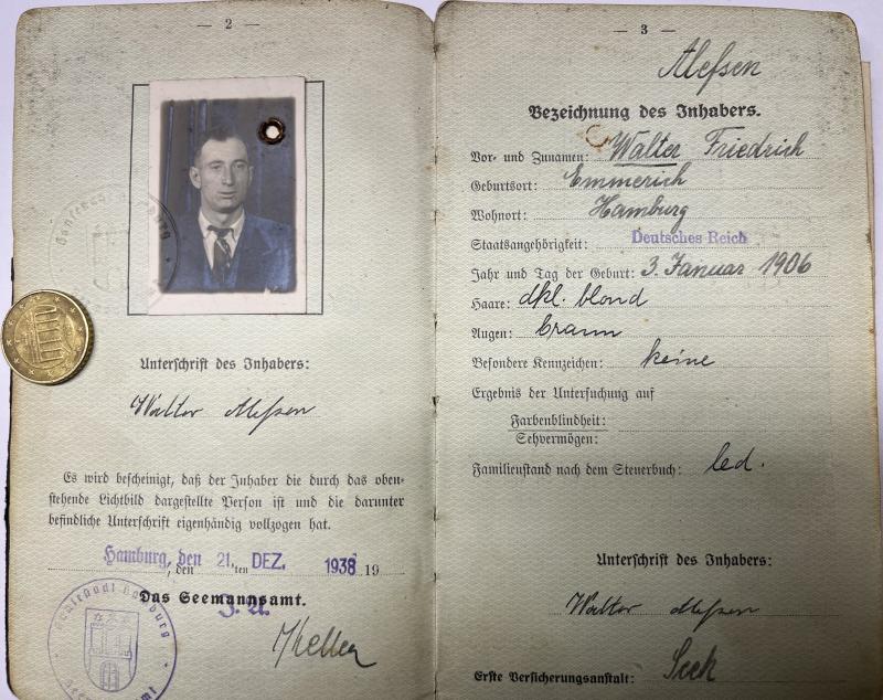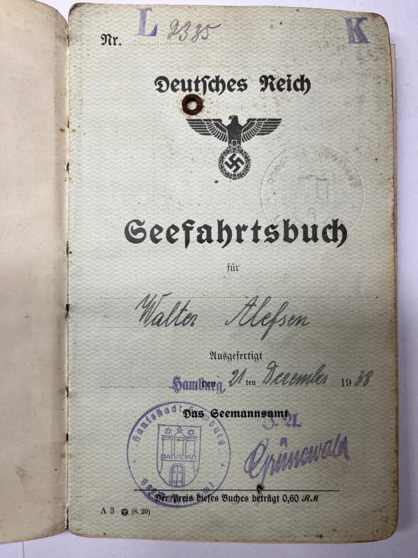 Wehrpass of "Maschinen Hauptgefreiten der Reserve" Walter Alefsen who served within the commercial shipping before he was drafted to serve within the KM.