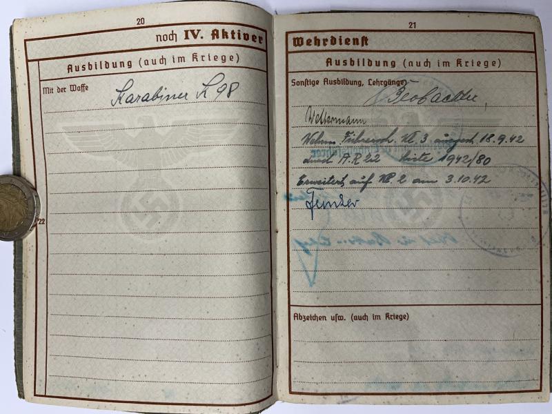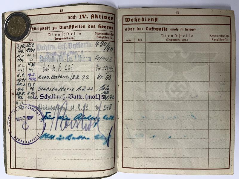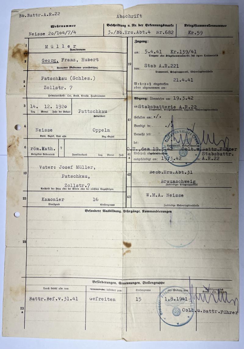 Wehrpass of "Obergefreiten" Georg Müller who served within Art.Rgt.22 of the 22.LL.Div.