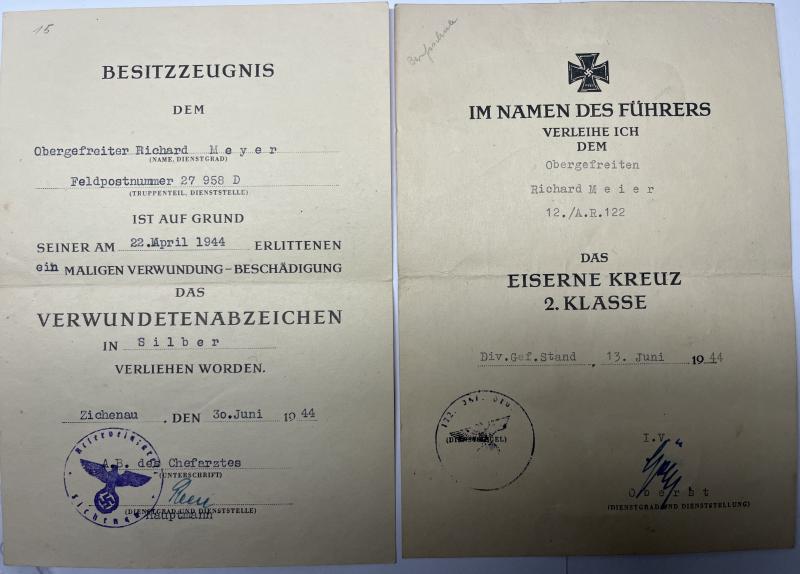 Soldbuch and citations of "Unteroffizier" Richard Meier who served within Art.Rgt.122 of the 122.Inf.Div.