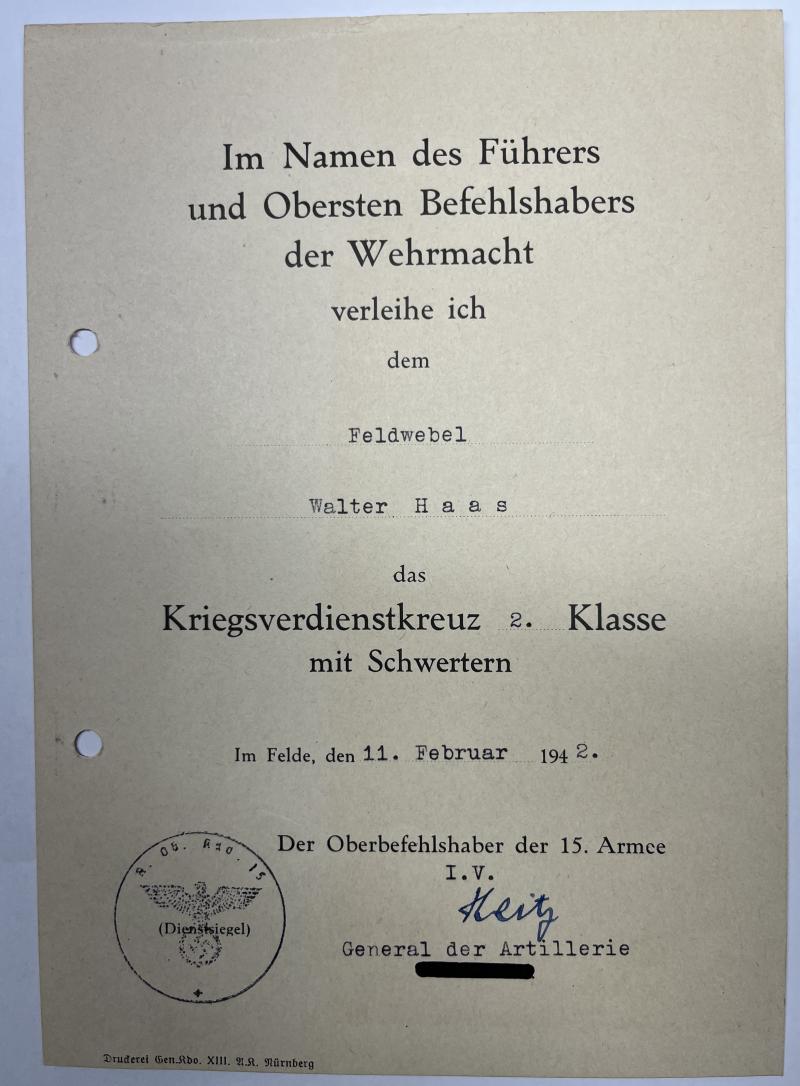 KvK II m.Schw. citation of "Feldwebel" Walter Haas who served under command of the 15.Armee.