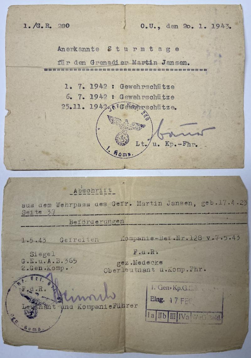 Wehrpass of "Gefreiten" Martin Jansen who served within several different units,mainly Jansen served within Gren.Ers.u.Ausb.Btl.365 under command of the Div.Nr.526.