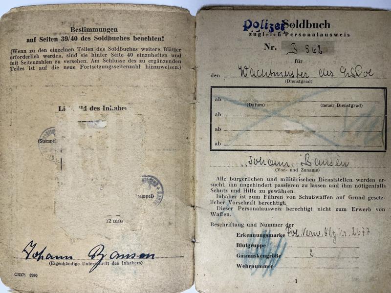 "Polizei" Solbuch and Wehrpass of "Wachtmeister der Schutzpolizei" Johann Bansen who served within the "Luftschutzpolizei" under command of "Kommando der Schutzpolizei Hanburg".