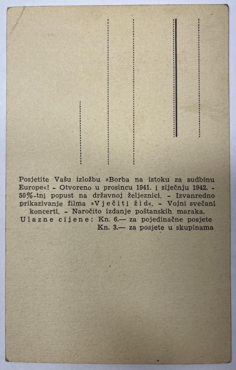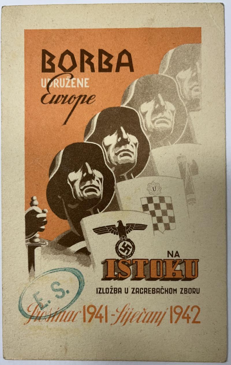 Croatian postcard "borba udruzenja Europa" (fight of the united Europe) has been issued during a fascist propaganda exhibition in Zagreb in 1941-1942.