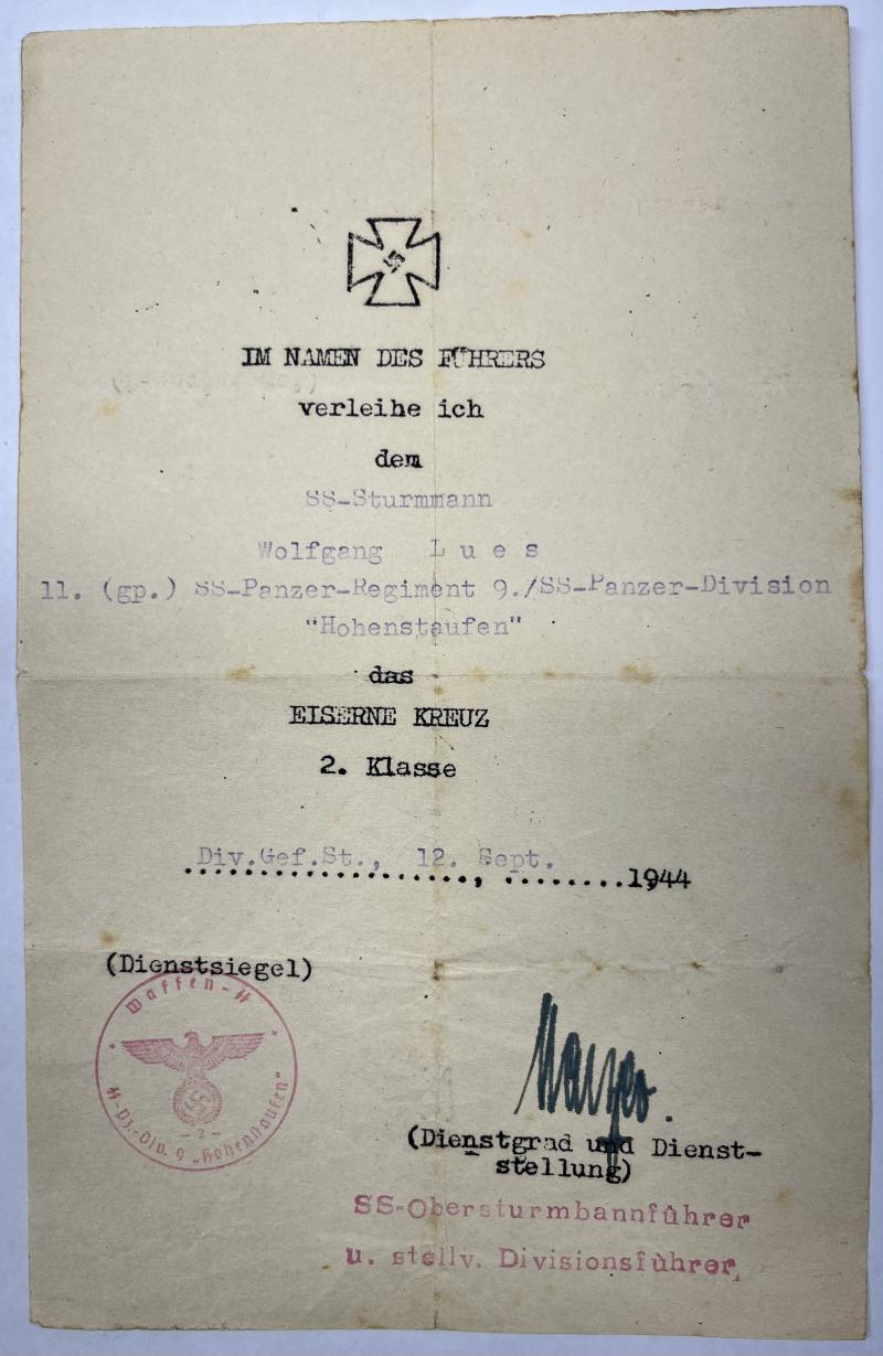 Great EK II citation of "SS-Sturmmann Wolfgang Lues who served within SS-Pz.Rgt.9 of the 9.SS-Pz.Div. "Hohenstaufen".