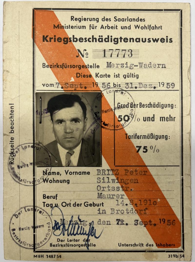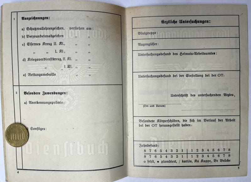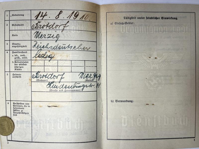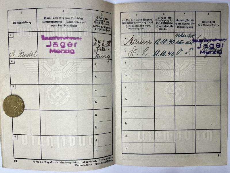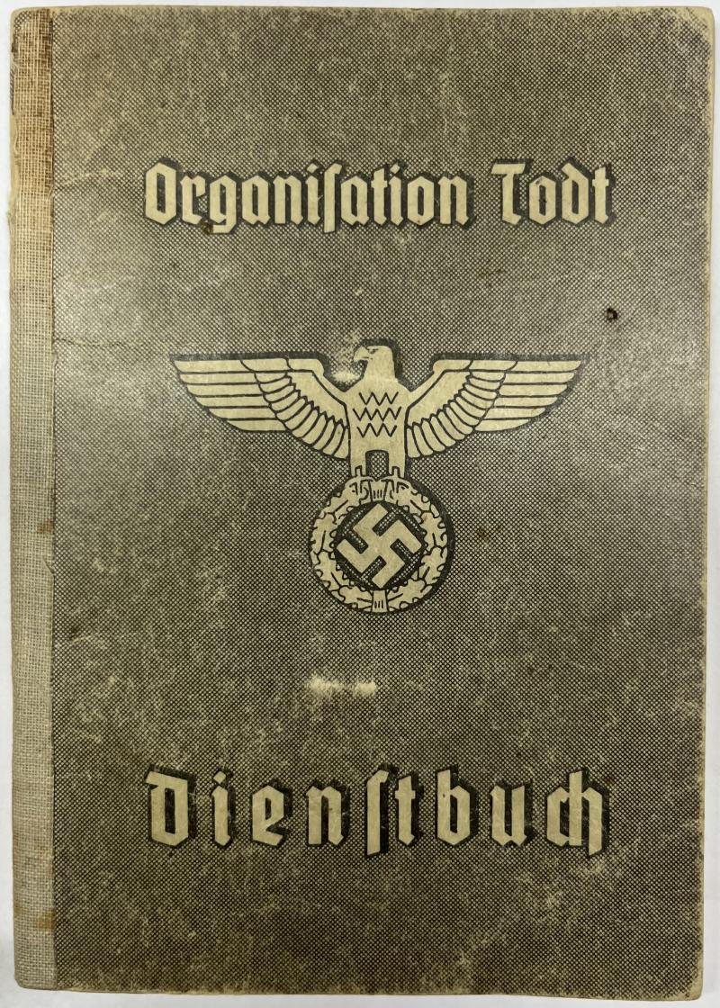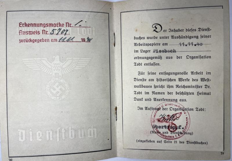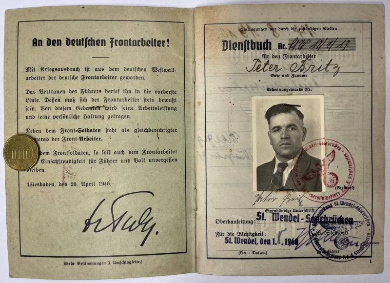"Dienstbuch" of "Frontarbeiter" Peter Britz who served within "Organisation Todt" at "Oberbauleitung" St.Wendel