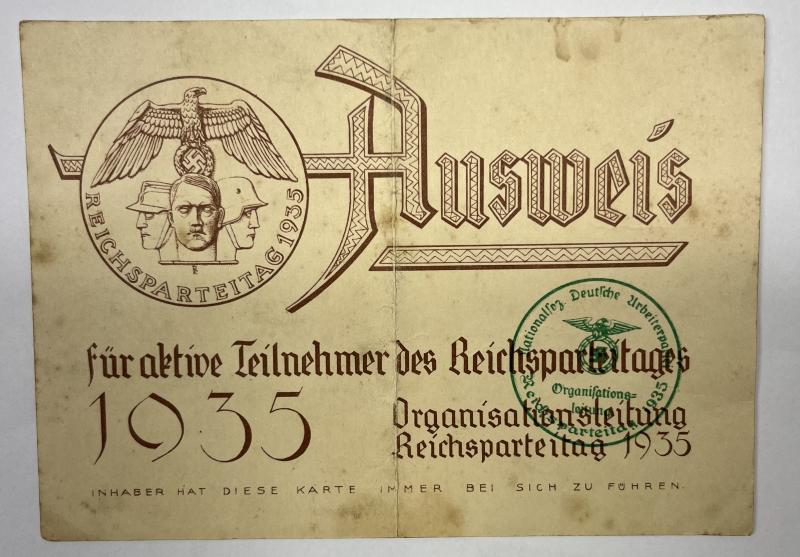 "Ausweis" (I.D.) for visiting the "Reichsparteitag" in 1935. The visitor was:"Arbeitsmann" Steck from "Arbeitsgau 27a".