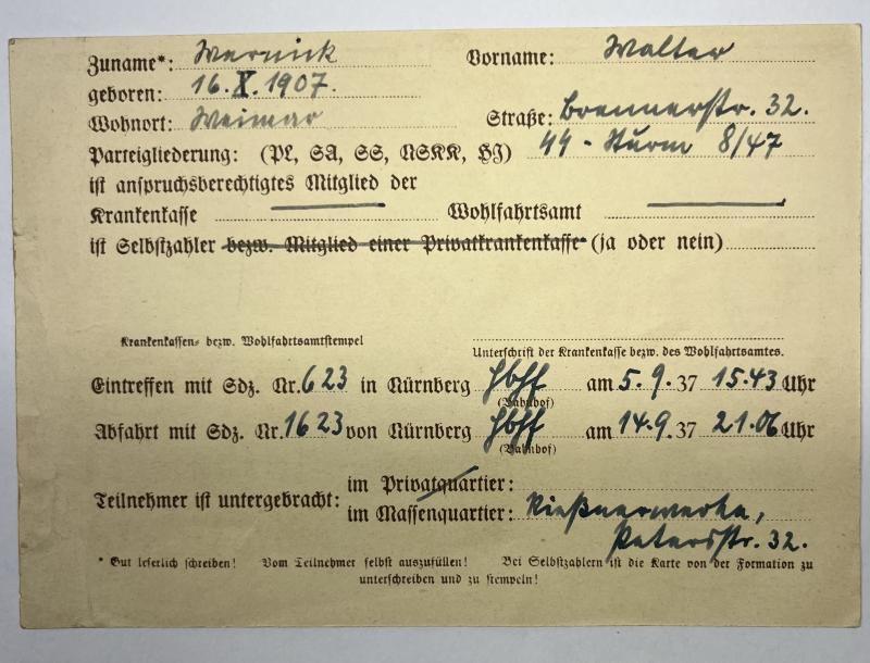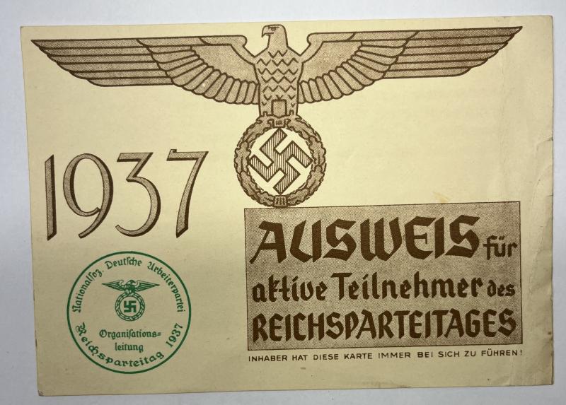 "Ausweis" for visiting the "Reichsparteitag" of 1937. The I.D. was used by Walter Waruick ? who was a member of the "SS-Stürm" 8/47.