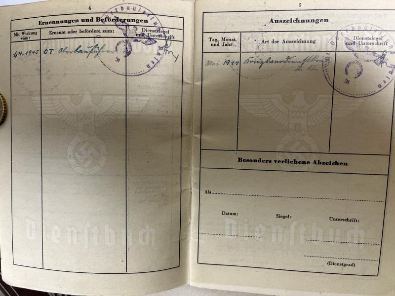 "Organisation Todt" Dienstbuch of "OT-Oberbauführer" Heinrich Fritz who served within OT-Front Rgt.126 under commnd of Front-OT Oberbauleitung Pölitz.