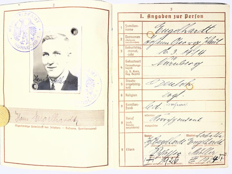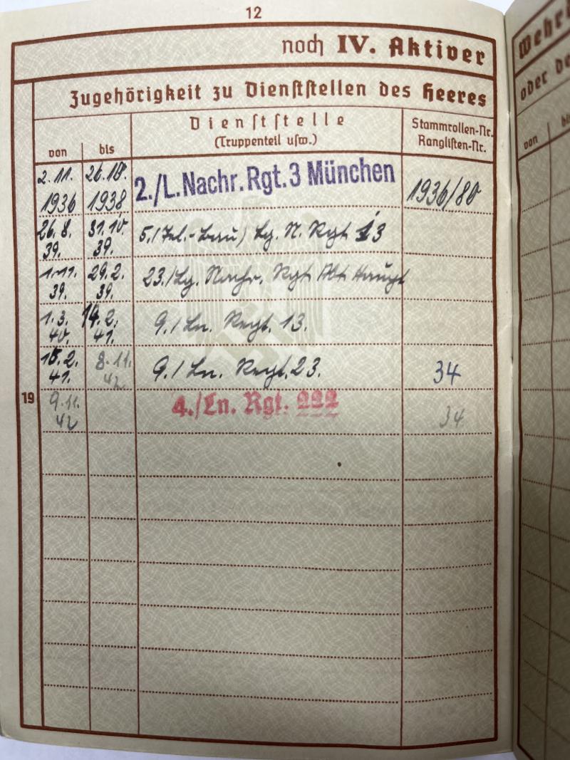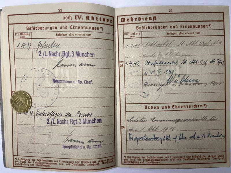 Wehrpass of "Oberfeldwebel" Hans Engelhardt who served within diverse Luftnachrichten units.