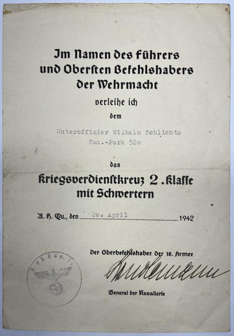 kvK II m.Schw. citation of "Unteroffizier" Wilhelm Schlichts who served within Sanitäts Park 520 under command of the A.O.K.18 (Armee Oberkommando 18).