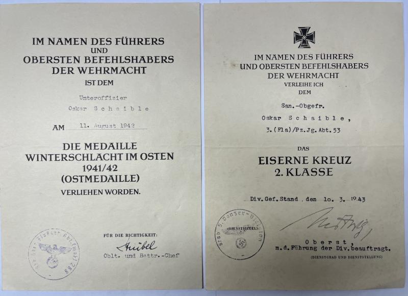 Citation grouping of "IUnteroffizier" Oskar Schaible who served within (Fla)/Pz/Jg.Abt.53 and finally Heeres Flak Art.Abt.(mot) 288 ,both under command of the 5.Pz.Div..