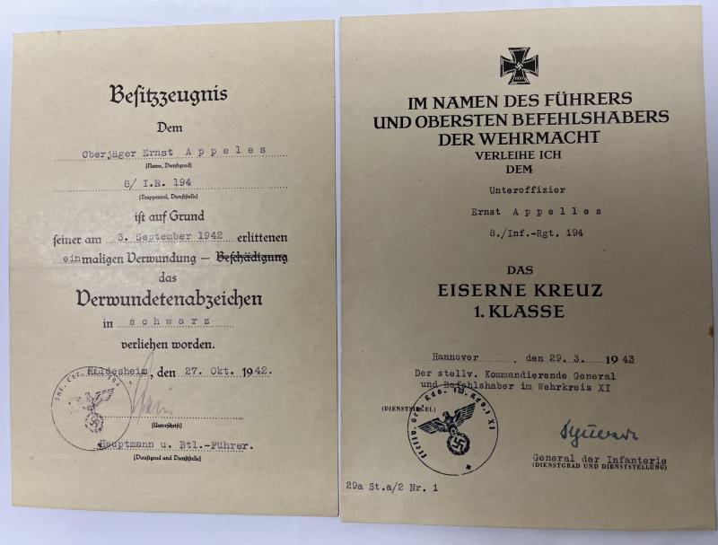 Citation grouping of "Unteroffizier" Ernst Appelles who served within Inf.Rgt.194 of the 71.Inf.Div.