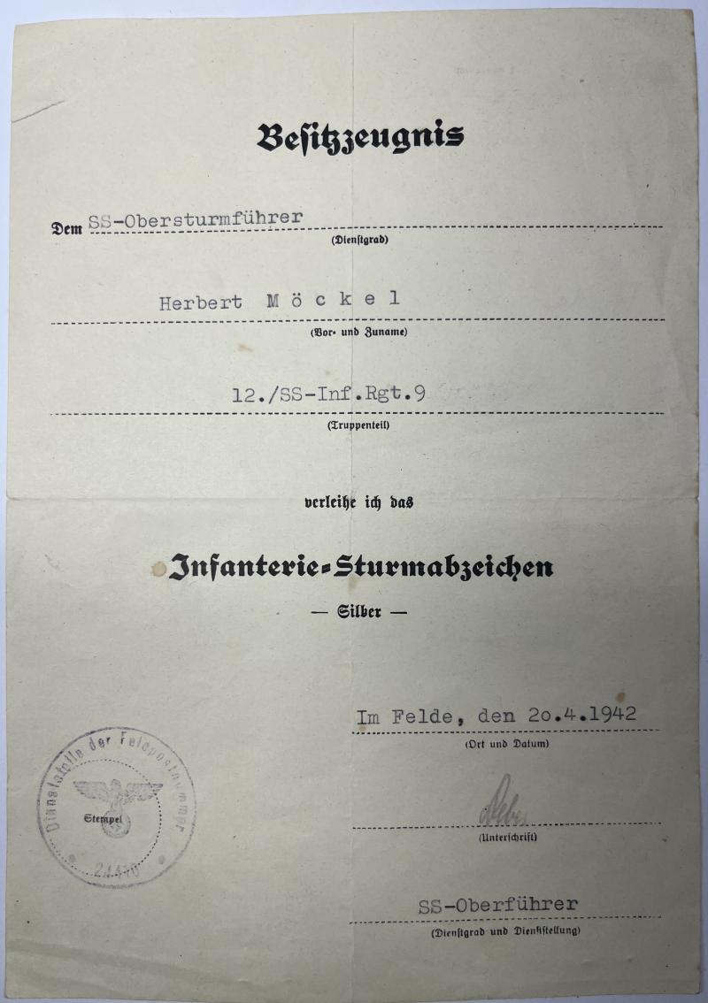 "Infanterie-Sturmabzeichen in Silber" citation of "SS-Obersturmführer" Herbert Möckel who served within 12/SS-Inf.Rgt.9 of the 6.SS.Geb.Div."Nord".
