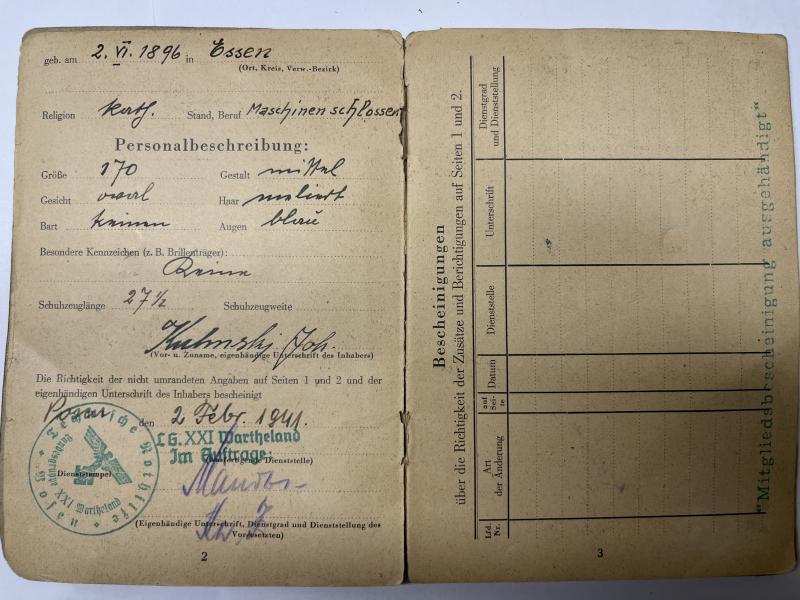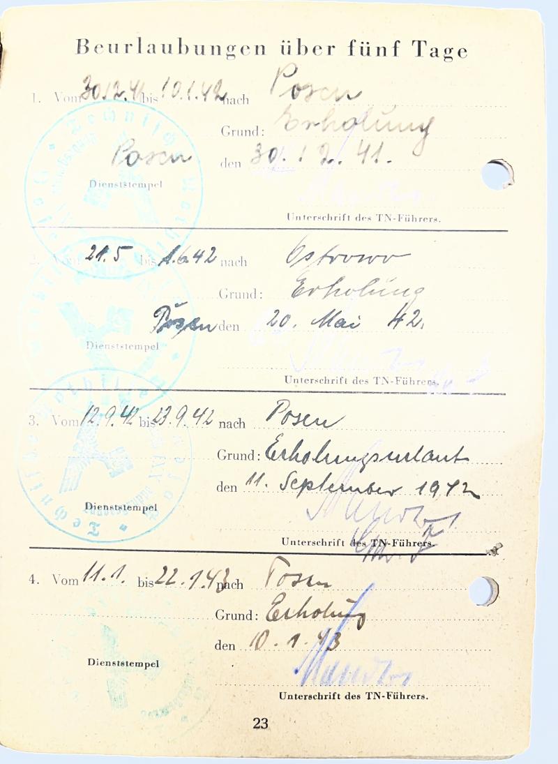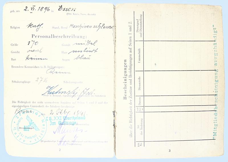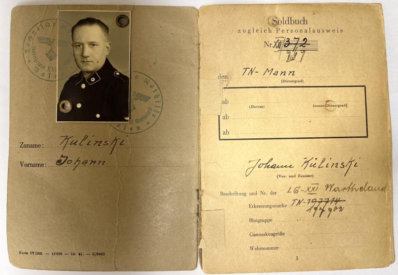 Rarely seen "Technische Nothilfe" (TeNo) Soldbuch of "TN-Mann" Johann Kulinski who served within Wartheland in western Poland (Warthegau/Wartheland)