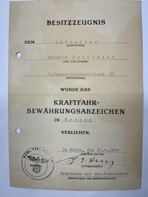 2) "Kraftfahrbewährungsabzeichen in Bronze" citation which has been signed by the commanding officer ,"Hauptmann" Franz?