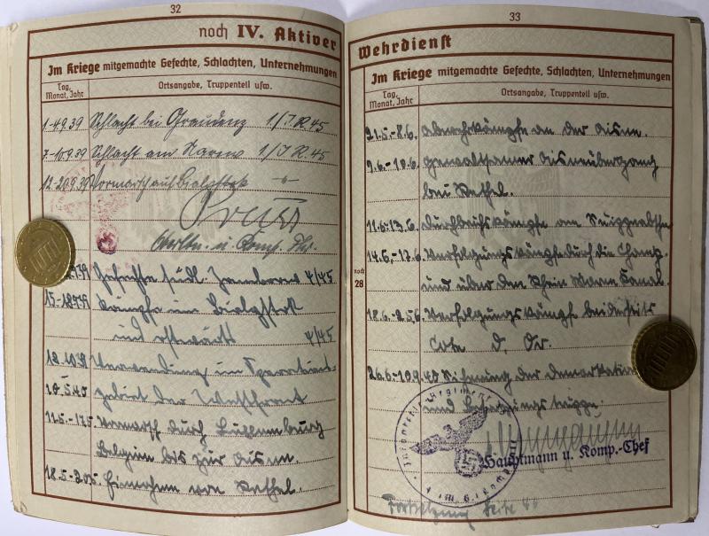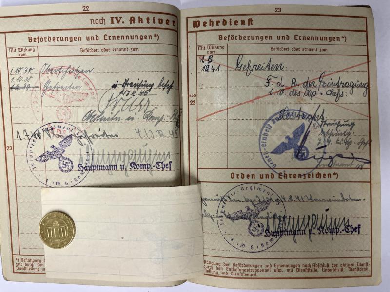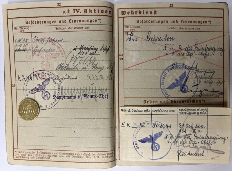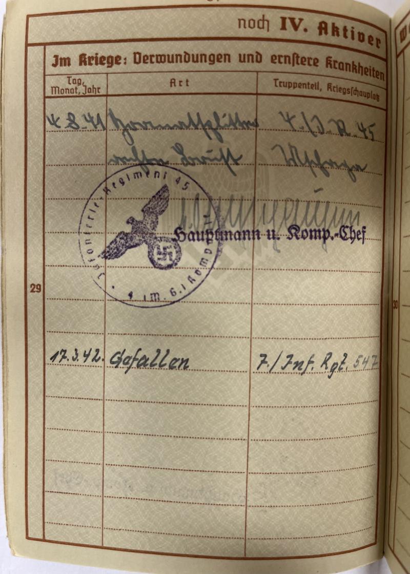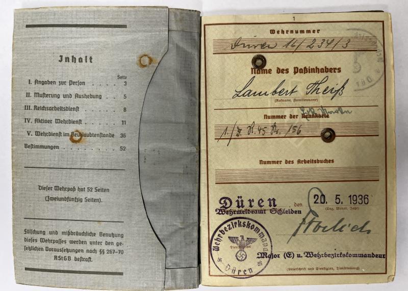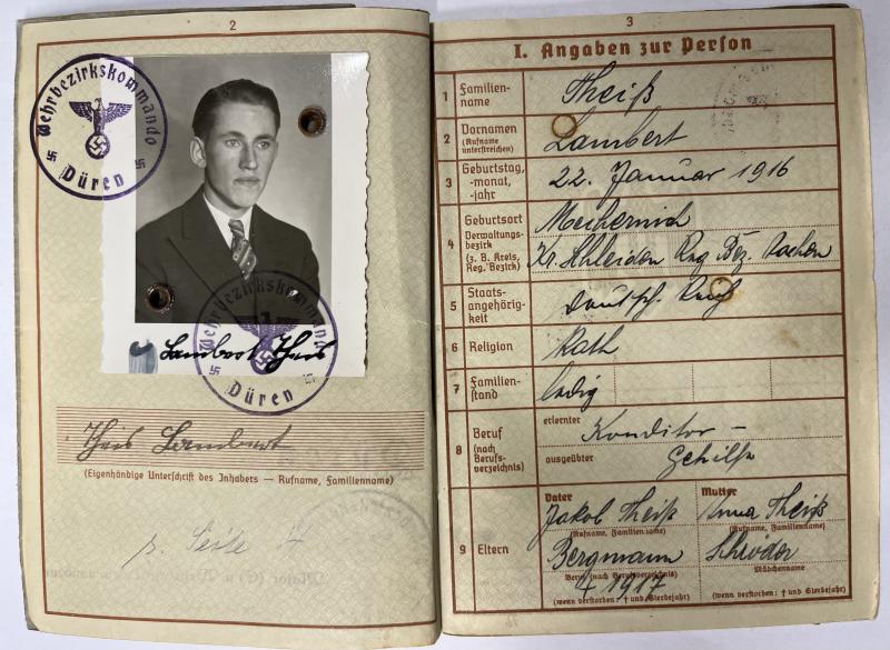 Wehrpass of "Obergefreiten" Lambert Theis who served within Inf.Rgt.547 of the 328.Inf.Div. Theis was awarded the BWB and the EK II (by 21.Inf.Div.) Theis was KIA on 17-3-1942.