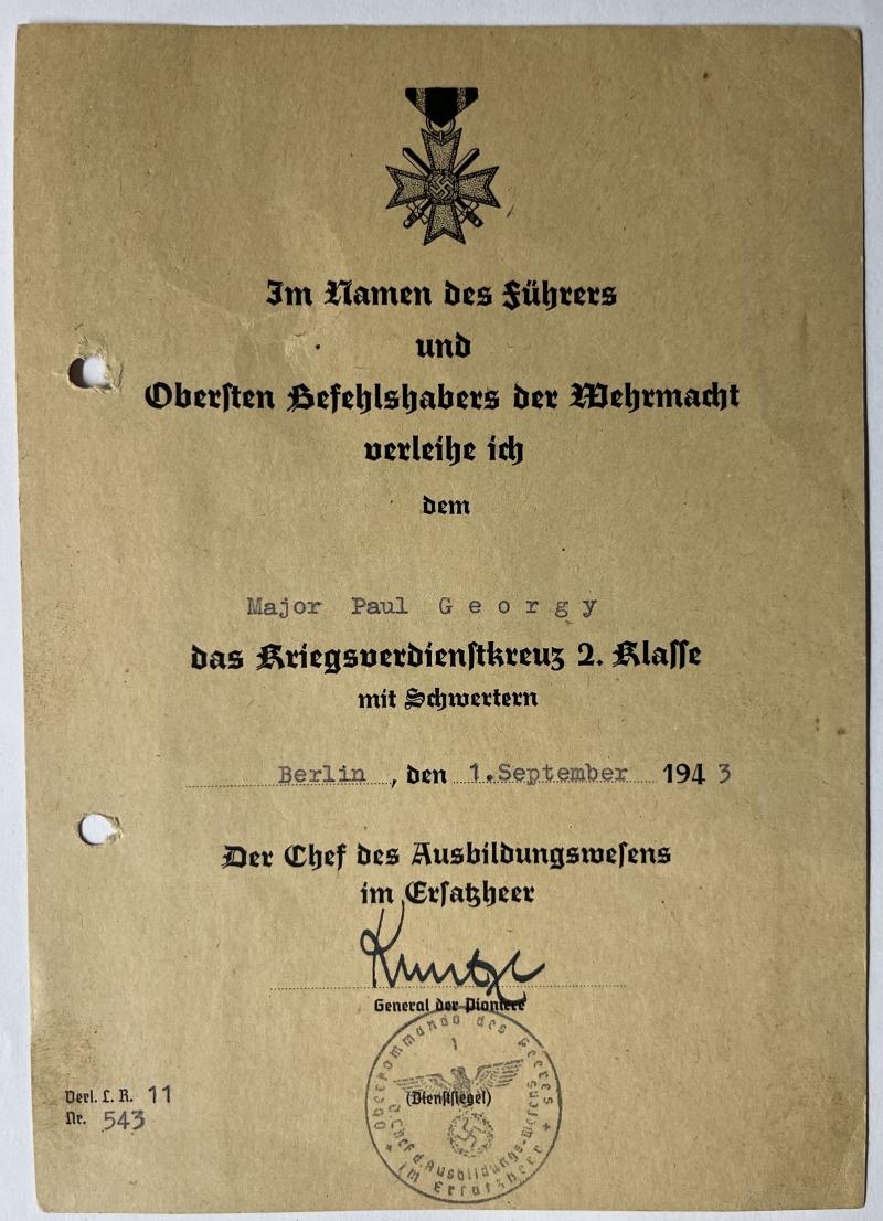 Very attractive KvK II m.Schw. citation of "Major" Paul Georgy.