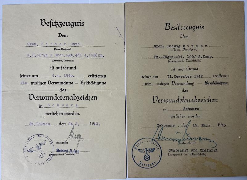 Citation set of "Grenadier" Ludwig Binder and his brother "Grenadier" Otto Binder who served within Pz.Jäg.Btl.100 of the 100.Jäger Div. and within Gren.Rgt.451 of the 251.Inf.Div.