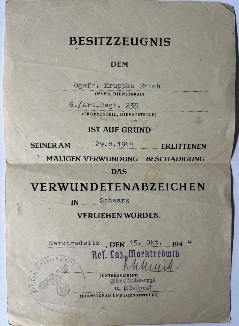The last unit Kruppke served in was: Art.Rgt.1080 of the 180.Inf.Div. which participated in fightings at Venlo/Netherlands and finally at Wesel/Germany before it was defeated in the "Ruhr" pocket.