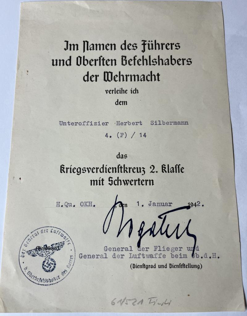 KvK II m.Schw.citation of "Unteroffizier" Herbert Silbermann who served within the Luftwaffe.