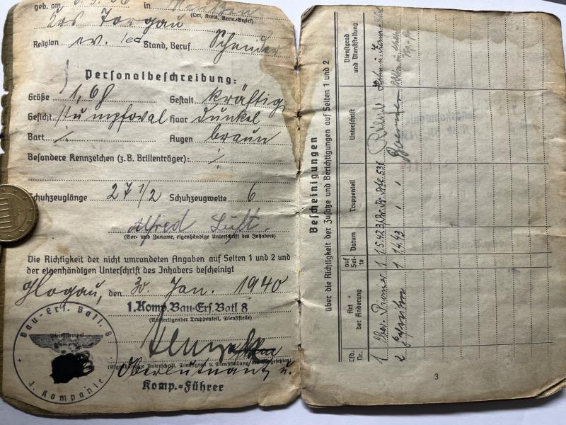 Soldbuch of "Gefreiter" Alfred Lüth who served within Brückenbau Btl.531. Lüth was awarded the "Ostmedaille" and the BWB. Needs some further research!